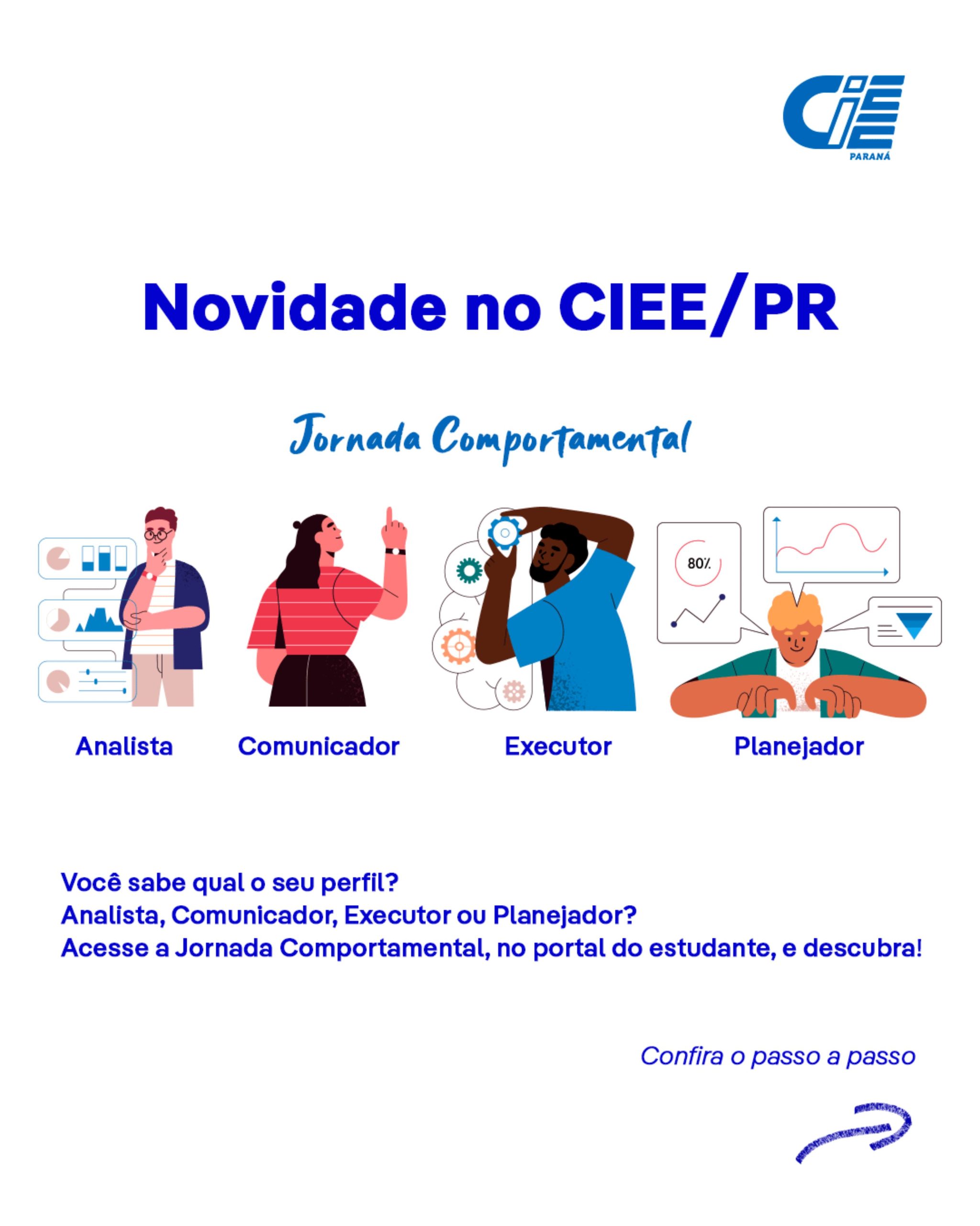 Aqui no site do CIEE/PR, você descobre tudo isso através da ferramenta de autoconhecimento “Jornada Comportamental” por meio de gamificação e storytelling, gerando um mapeamento comportamental que faz a identificação do seu perfil predominante.
