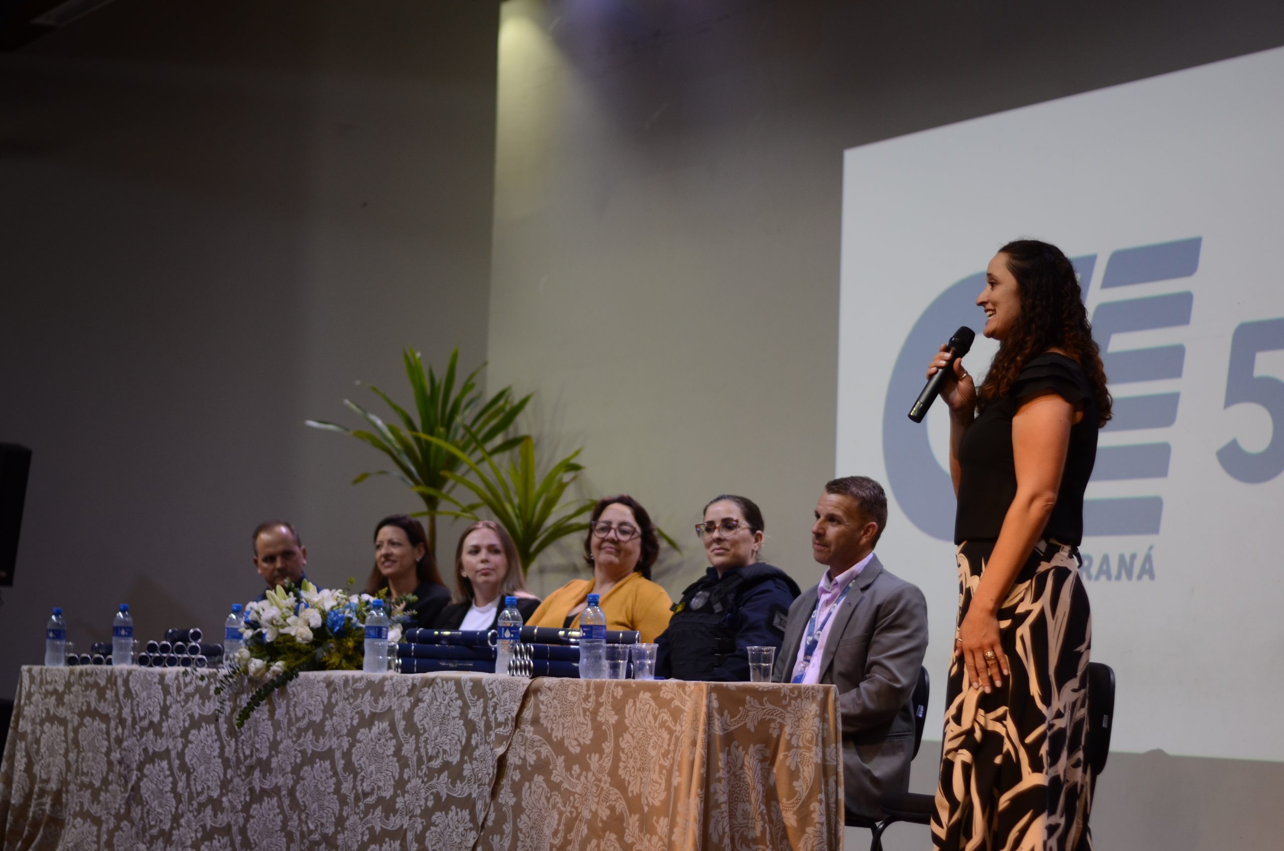 A mesa diretiva foi composta por representantes de empresas parceiras, incluindo o gerente da Nichele Materiais para Construção, Carlos Bubniak; as gerentes do Sicredi, Denise e Isabella; a representante da C.A.W. e paraninfa homenageada, Ana Lúcia Werner; a comandante da Guarda-Mirim e estagiária pelo CIEE/PR, Karina Dabroswski; o gerente Rodrigo Natal e a coordenadora de Campo Largo, Patricia Costa, ambos do CIEE/PR.